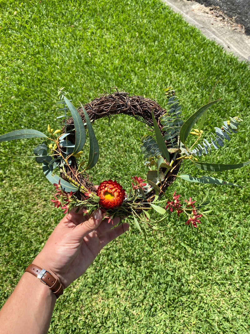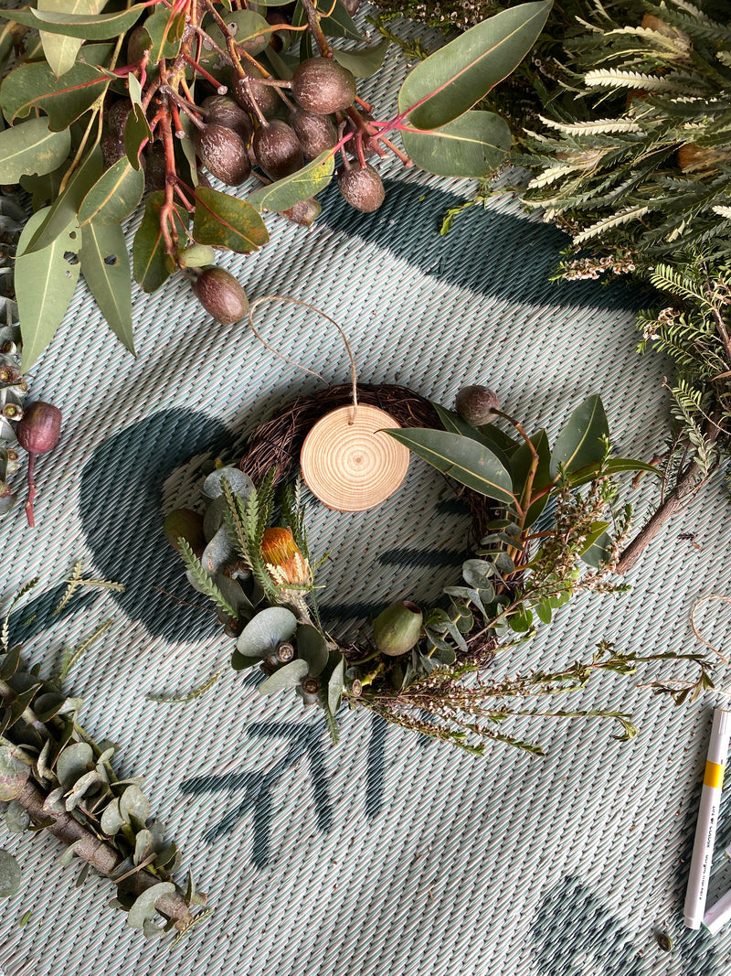 In this Christmas Wreath making workshop we only use native Australian plants, so in the spirit of an Australian Christmas we’ll teach students about native vs exotic vs invasive plants and why this matters. We’ll also explain the basics of floristry, and then the steps on how to make a wreath using native plants and flowers, gumnuts, wooden pieces which you can decorate, as well as twine, wire and ribbon!